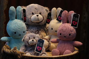 ......en voor bij de geboorte-boeketten hebben we  2 maten Beer Bella : S/15 cm € 9.95 en L/40 cm à € 23.95 , of kies je voor een Nijntje in het  blauw , wit of roze à € 19.95,